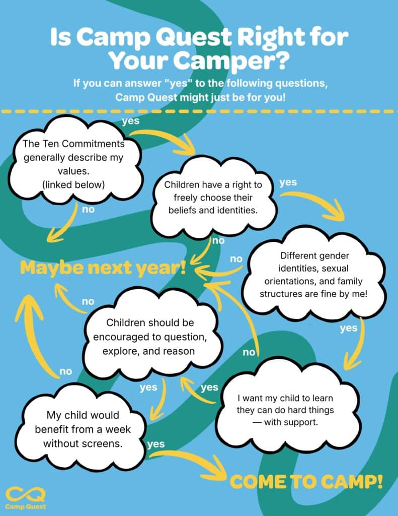 Is Camp Quest Right for my Camper? Take the quiz below and consult our resources to see if Camp Quest is the right fit for your family! Find the Humanist Ten Commitments here. Ready to register? Find our camp locations here.